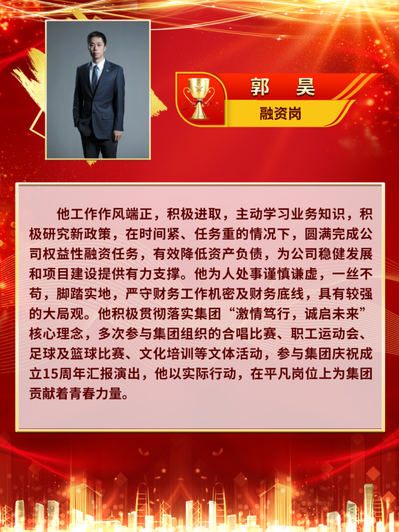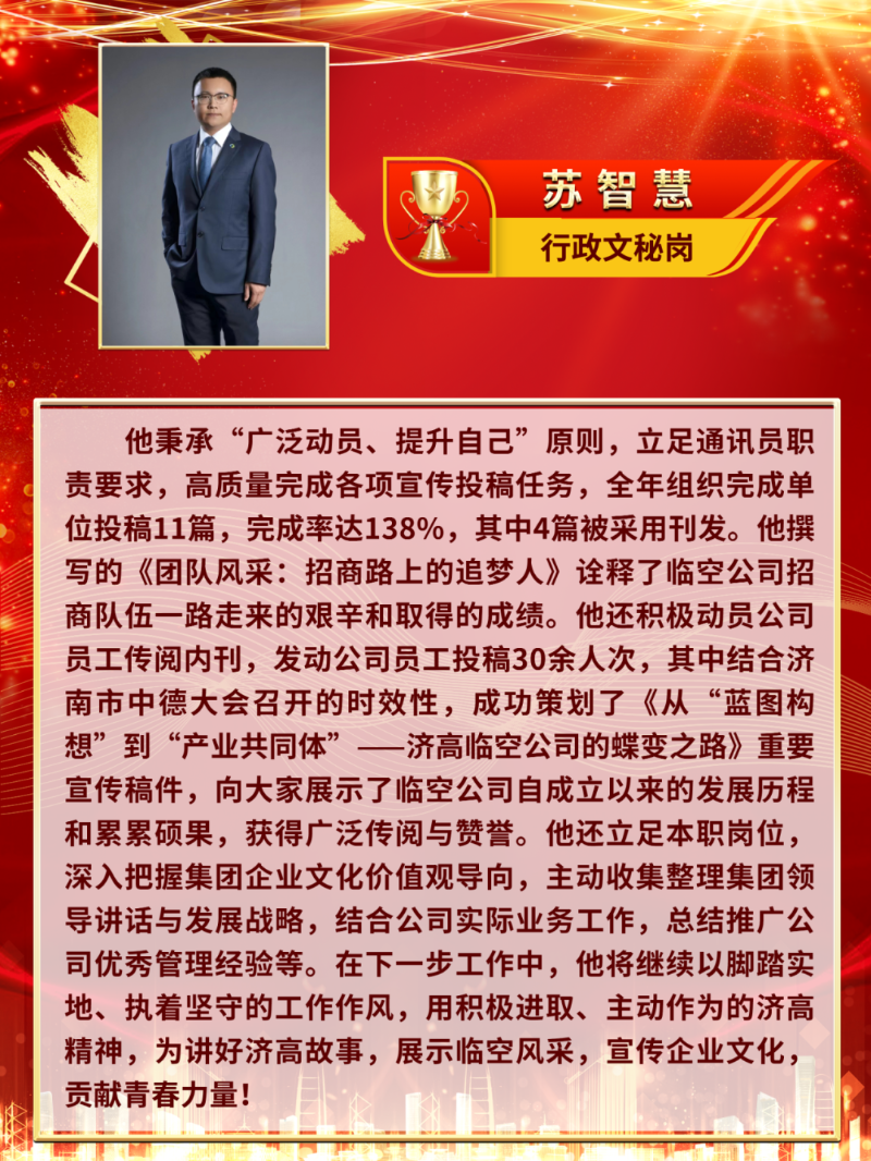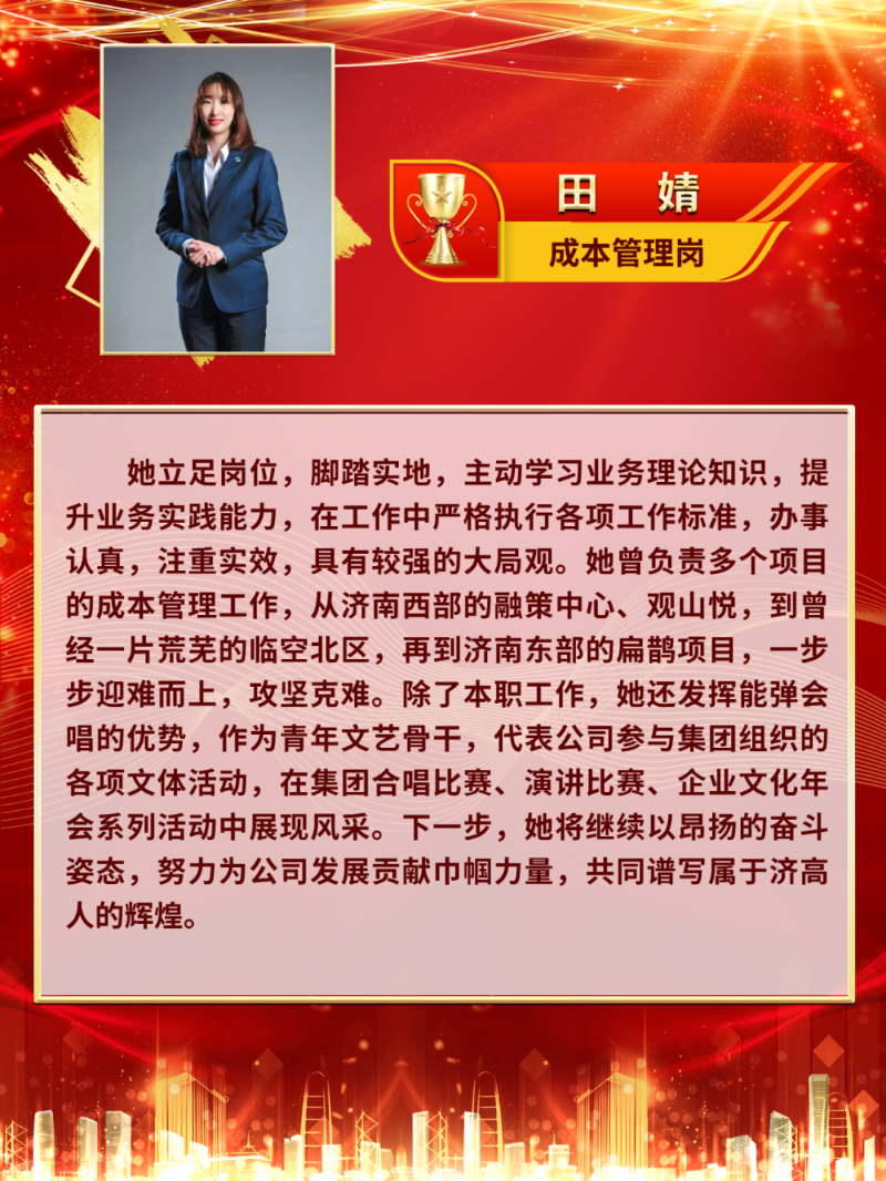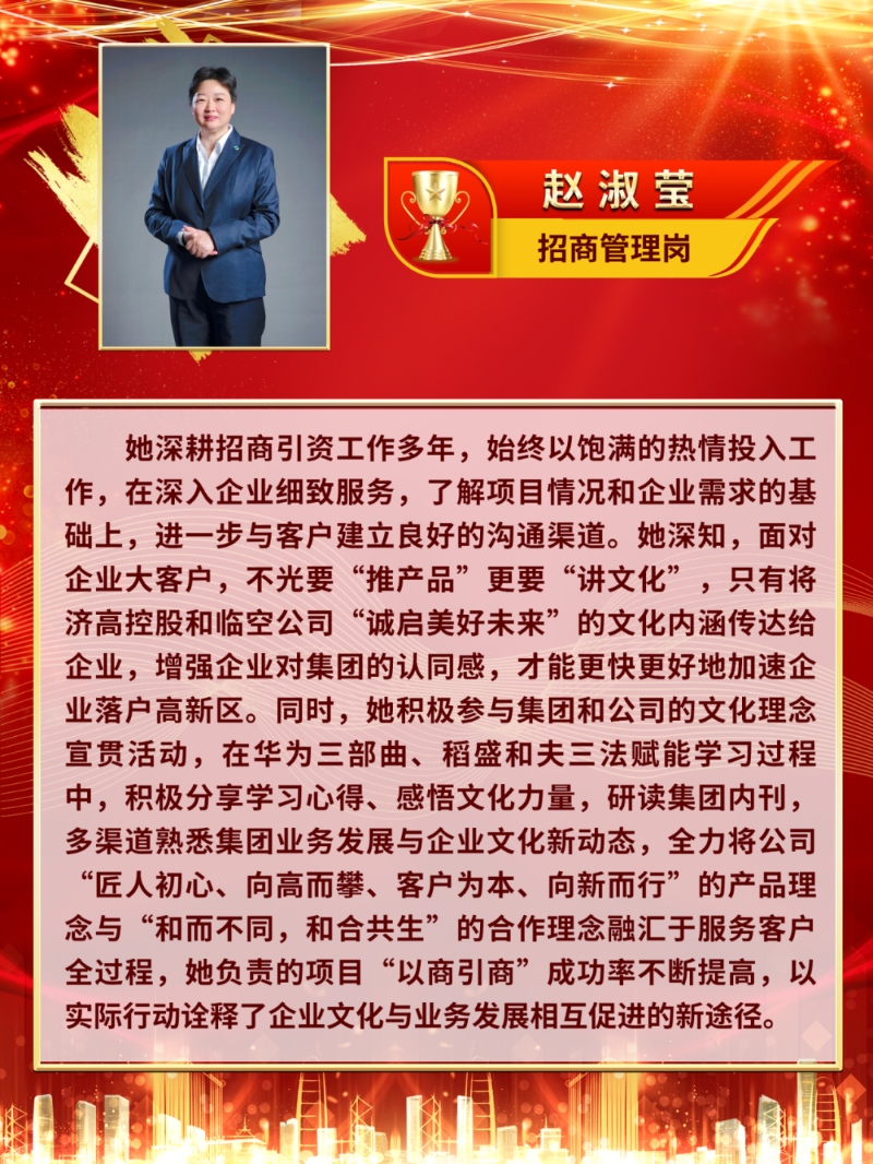您当前的位置:首页 新闻动态 > 集团要闻 豪情笃行·身旁的模范|济高控股集团企业文化进步前辈展播③ 发布日期:2024-01-11 17:08作者:admin 来历:济南高新控股集团有限公司 浏览: 次字体:[年夜][中] [小] 【编者案】2023年,济高控股集团深切进修贯彻党的二十年夜精力,牢牢缭绕济南高新区“四高”设置装备摆设要求,深切鞭策企业文化设置装备摆设与高质量成长高度交融,引领职工发扬“三创、三真、三干”的济高精力,连续阐扬“文化引领、凝心铸魂”作用,慢慢构建了对于外揭示一流现代企业形象、对于内泛博职工遍及认同的文化系统,持续两年获评“山东省企业文化设置装备摆设进步前辈单元”,初次荣获“山东省企业党建优异品牌”。与此同时,集团各部分、各级公司也涌现出一多量于企业文化设置装备摆设方面作出孝敬的进步前辈典型。现对于他们企业文化设置装备摆设方面的进步前辈业绩举行展播—— 济高临空公司 企业文化设置装备摆设环境先容 2023年,济高临空公司全方位贯彻集团企业文化事情部署,踊跃推进公司企业文化设置装备摆设,荣获2023年度“济高控股集团企业文化进步前辈单元”。公司阐扬地点金年会片区的宣传辐射上风,集中打造临空文化品牌,将高新区“1334”成长思绪、集团企业文化理念、公司战略营业成长等内容畅通领悟领悟、简练上墙。公司前后高尺度设置装备摆设了党建勾当室、文化理念展示墙及职工之家、念书角等文化阵地,全力打造的“链聚临空”党建展厅荣获了2023年度“山东省企业党建优异品牌”,为集团文化设置装备摆设再添殊荣。公司缭绕庞大勾当踊跃投稿《进修强国》《济南日报》等上级主流媒体,同时于集团公家号、集团内刊不停推送反应“临空片区成长过程、财产设置装备摆设不停迭代进级、招商引资财产配套设置装备摆设”等内容的宣传文章,连续扩展宣传影响力,不停晋升文化软实力。公司还有踊跃介入集团各项体裁勾当,荣获2023年度“济高控股集团五四青年节演讲角逐”三等奖;联合传统节日自立筹谋温馨生日会;以“共创、同享、双赢、共荣”为主题,举办济高临空财产集群园区成长沙龙勾当,周全赋能园区成长。 一年来,公司始终以现实步履把“豪情笃行,诚启将来”的焦点理念、“三创、三真、三干”的济高精力贯彻到营业成长中,将来,济高临空公司将以越发丰满鼓动感动的斗志,践行“成长高新、办事高新”初心任务,为集团高质量成长孝敬更鼎力大举量!